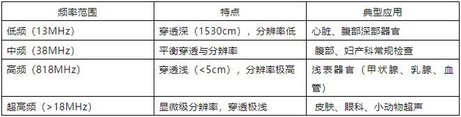 超声探头的频率直接影响穿透深度和分辨率,一般遵循 “高频高分辨率,低频高穿透” 的原则。
